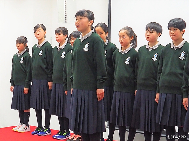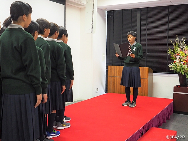 また、手塚女子副委員長から贈られた「夢を実現するために、この3年間をどう過ごすか、何を意識してどのように努力していくのか、それがとても重要。感謝の気持ちを忘れずにサッカーや勉強に励んでください」という言葉を、真剣な眼差しで聴いていた8期生は、JFAアカデミー堺に入校したことを改めて実感し、気を引き締めている様子でした。