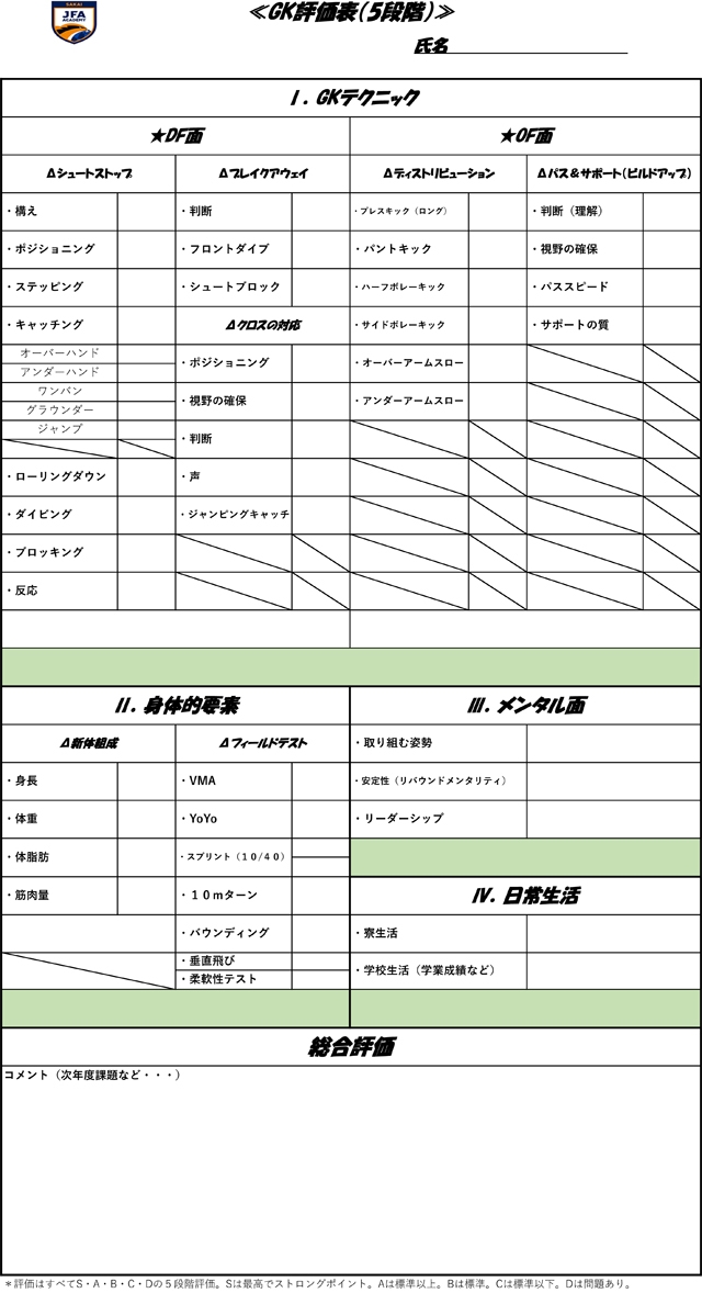 項目は大きく分けて4つあり、それを5段階で評価しています。4つの項目はテクニック(OFとDF)、フィジカル、メンタル、日常生活(寮生活と学業成績)です。5段階評価はS・A・B・C・Dで、Sはストロング、Bは標準、Dはウィークポイントですぐにでも改善が必要な項目となります。