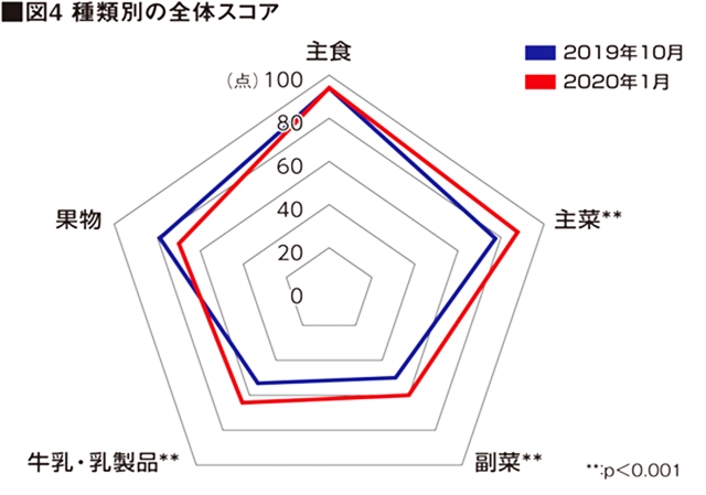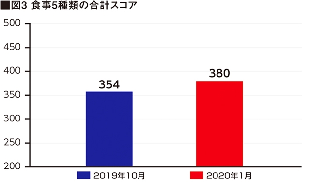 栄養指導開始時、帰省時の食事摂取量がアカデミーでの摂取量と比較して少ない傾向が見られました。指導を始めた2019年10月と2020年1月を比較した結果、栄養指導実施により食事5種類のスコア合計点(500点満点)は、全学年の全体スコアの平均が354から380に変化し、食事の改善がみられました。種類別のスコア変化を見ると、主菜、副菜、牛乳・乳製品はスコアが上がりました。このように月1回の評価・指導ですが、一定の成果がみられています。