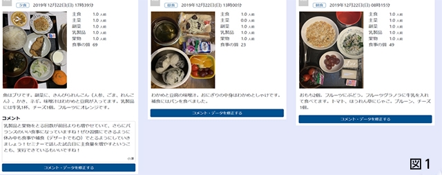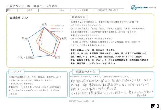 今年度からはさらに、保護者の方から食事や栄養に関するコメントをいただくようにしました。こうしたやり取りは、家庭での選手の様子や家庭の食事で困っていることを把握するツールの一つになっています。(図1.2)