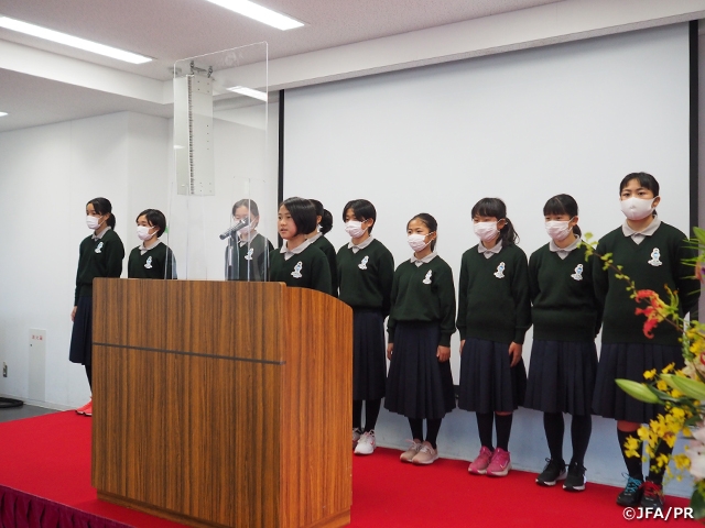 私は色々な人に応援してもらってJFAアカデミー堺に入ることができました。応援してもらっているということは、JFAアカデミー堺で一生懸命サッカーを頑張るという責任があると思います。責任を持つというのは色々なことを進んで引き受けて、最後までやりきるということと、オフザピッチでもチームの一員として活躍できる行動を取ることだと思います。だから私も仲間やチームにとって今何が必要か考えて行動できる選手になります。