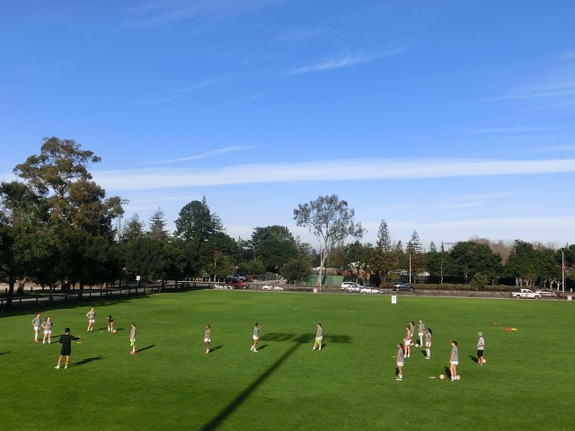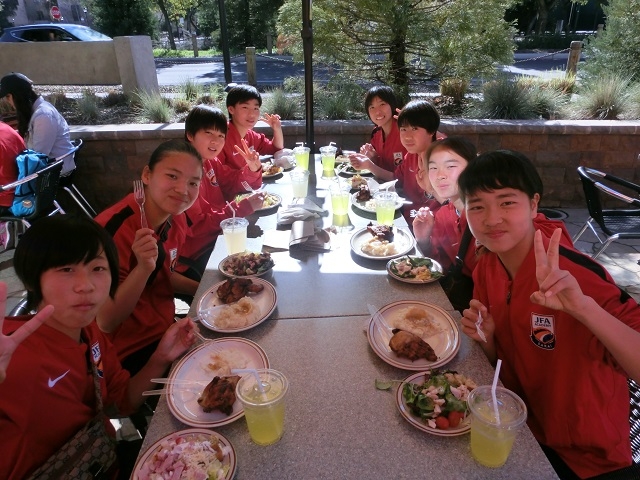 サッカー場では、スタジアム、練習グラウンド、ミーティングルーム、ロッカールームなどの設備が整っていて、とてもびっくりしました。女子サッカー部のトレーニングには、アメリカの年代別代表が何人もいて、パスの質やシュートの精度がとても高く、私も見習いたいと思いました。