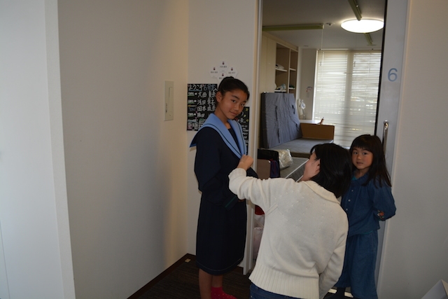 中学校に制服に袖を通し、サイズをチェックします。「お姉ちゃん、かっこいいよ。」