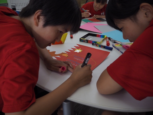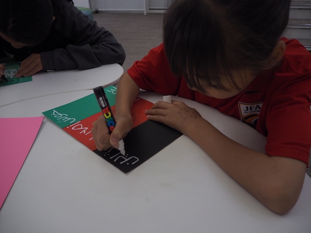 学習時間を使って国旗作りが始まりました。描くだけでなく切ったり貼ったりと国旗作りは図工の授業のようでした。