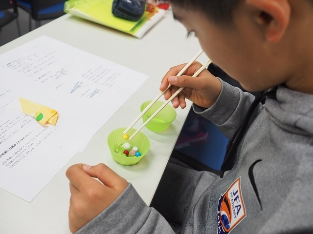 そしてお箸の取り方。机に置かれたお箸をどのように手にするのが正しいのかを学び、実際にビー玉のような小さな丸い玉を使って、お箸で上手につまむ練習をしました。