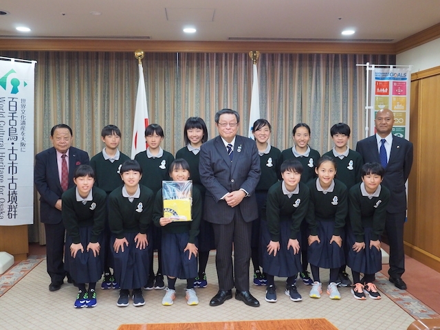 市長室に入った時はとても緊張していましたが、最後の記念撮影の時には笑顔が見られました。