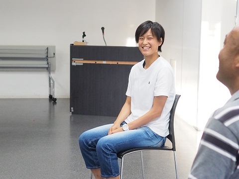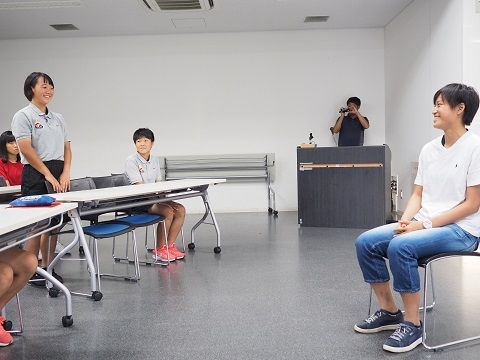 現役生36人が揃ったところで、加藤チーフコーチとのトークショー形式でワールドカップのメンバーに選ばれた時の気持ちや大会中に感じたこと、アカデミー時代のエピソードなど様々な内容について語ってくれました。もともと口数の多い選手ではありませんでしたが、トップアスリートに成長して様々なメディアに対応してきた実績もあり、アカデミー生のためにしっかりと丁寧に話をしてくれました。聞いている選手たちも憧れの先輩を前に緊張の面持ちでしたが、徐々に表情も緩み、質問コーナーでは何人もの選手が手を挙げて質問をしていました。質問にも丁寧に対応する宝田さんの姿に人としての成長を感じました。