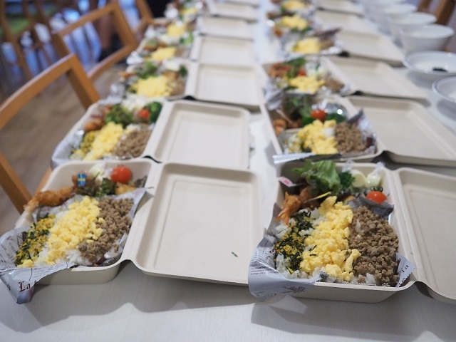 お昼休みは体育大会特製のお弁当です。前日からバナナに仕込みをする総務の大江に群がる選手たち。