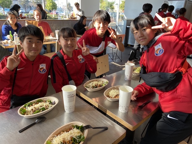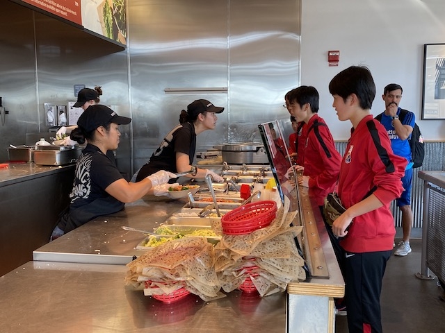 試合後、メキシコ料理のファーストフード「Chipotle」で簡単にランチを。ボリュームがありすぎて多くの選手はサラダ中心の料理をチョイスしていました。