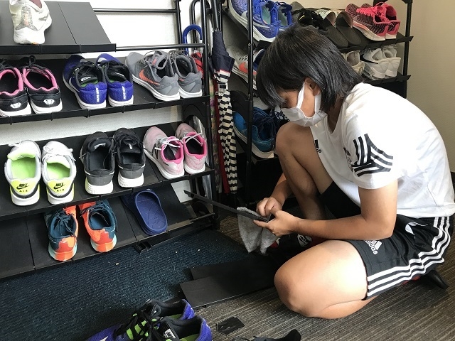 こちらは、スパイクが置いてある下駄箱を担当する3年北川と2年松本。黙々と取り組んでいるようです。奥ではコーチが目を光らせています。