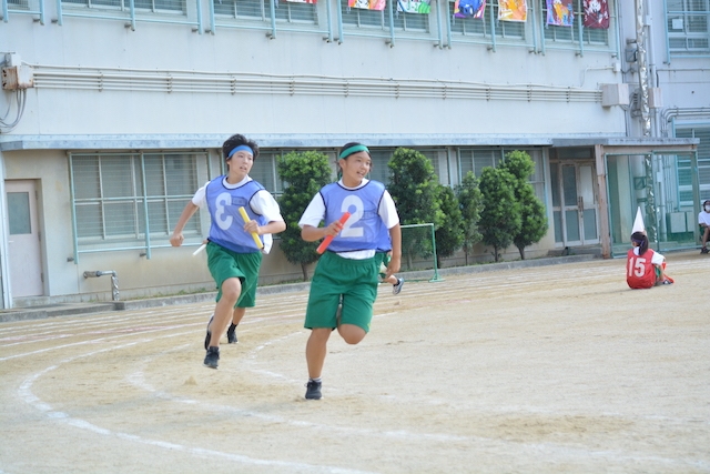2人3脚から4人5脚まで様々な人数で走る、クラス対抗のリレーです。。