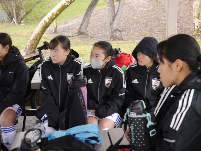 アウトレットを後にして、16時キックオフにに向けて試合会場に移動します。とその時ちょうど雨が降り始めました。濡れたピッチが吉と出るか凶と出るか。雨よけのできるスペースでアップ前のミーティング。