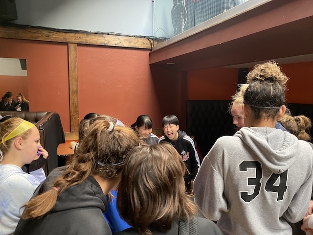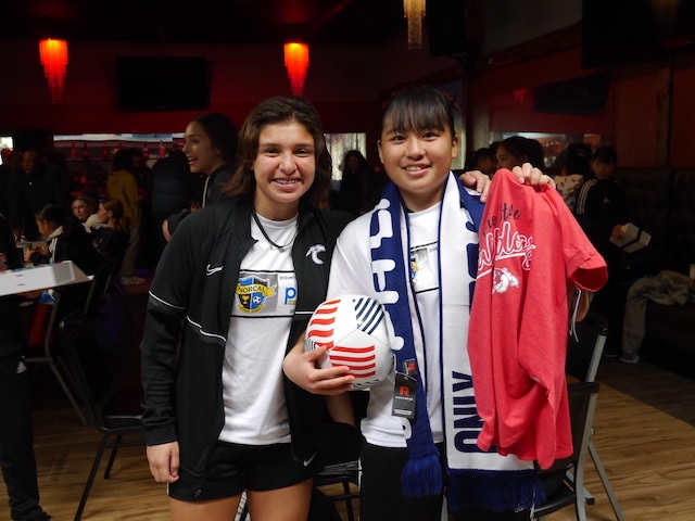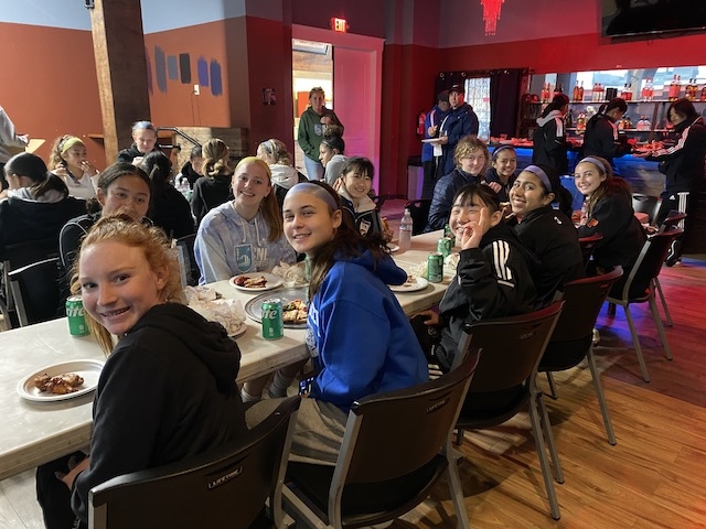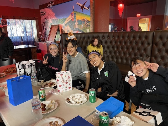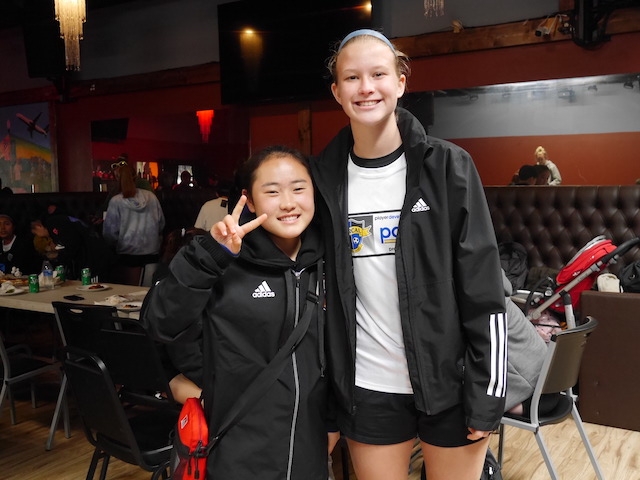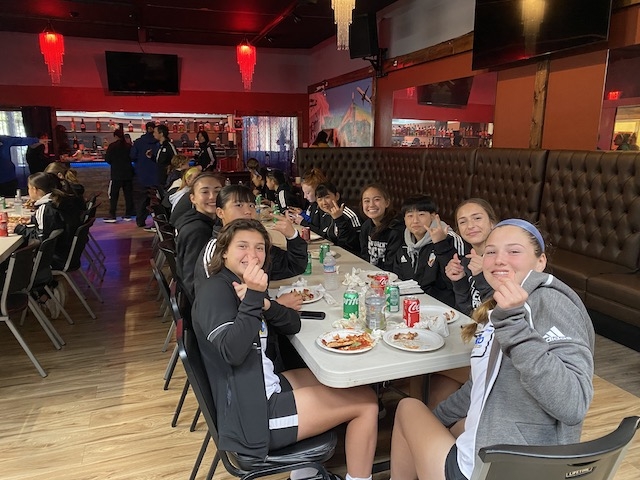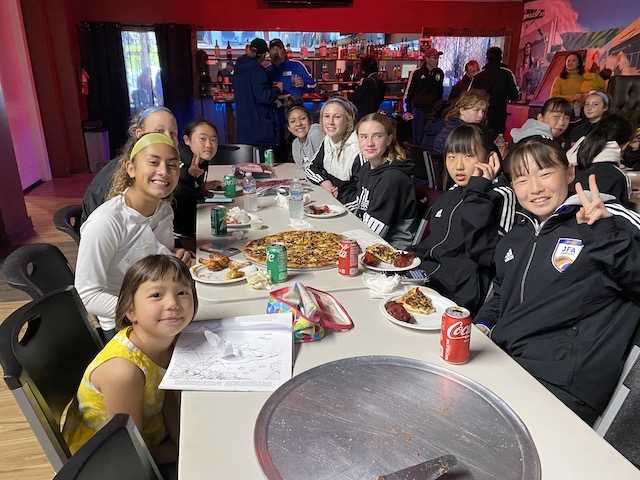 試合の後は、PDPがオーガナイズしてくれたピザパーティー。両チームの選手が互い違いに座って、交流しながらのランチタイム。