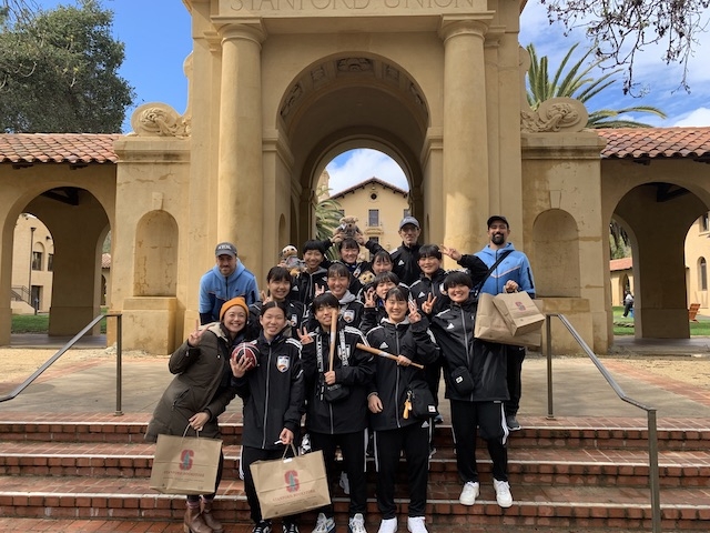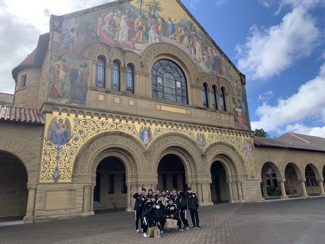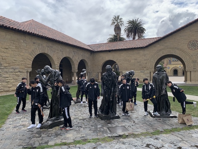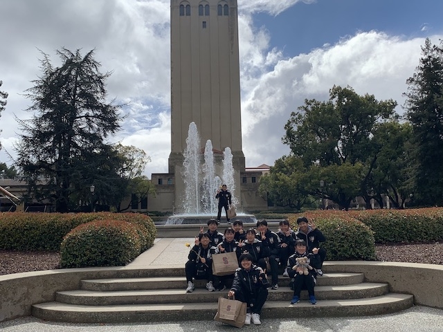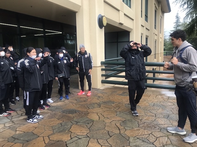 3日目の午前中はスタンフォード大学のサッカーグラウンド前の駐車場に集合し、大学の校内を見学しました。アメリカンフットボールのスタジアム前で集合写真を撮ることが恒例行事となっています。午前中は、スタンフォード大学の男子サッカー部に所属するリアムさんが我々を案内してくれました。リアムさんは中学校までは東京で暮らしていたので日本語で案内をしてくれました。