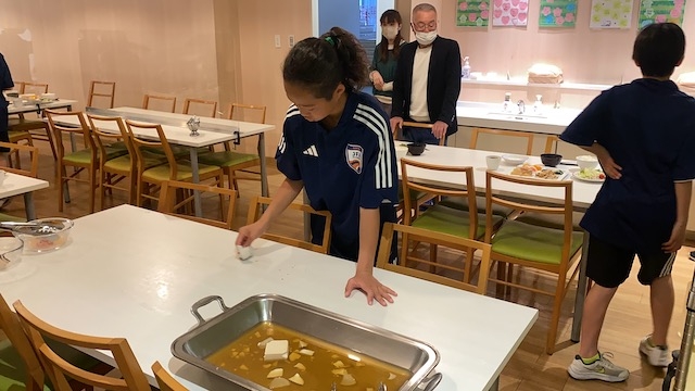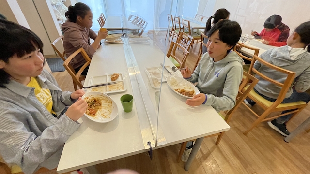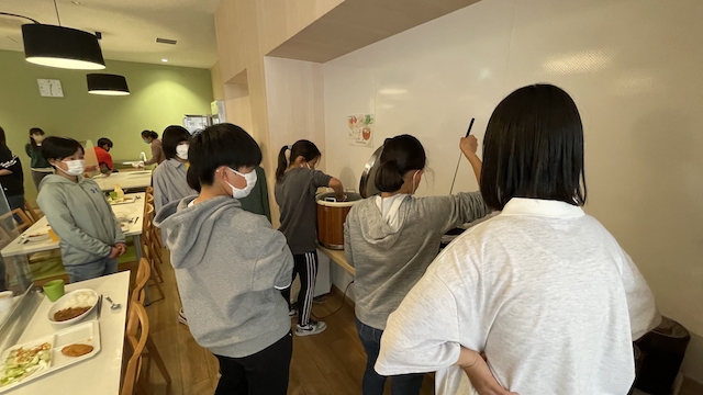 まもなく夕食の時間になりました。みんなで手分けして盛り付け&配膳をしていきます。