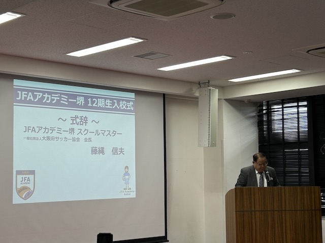 はじめに、一般社団法人大阪府サッカー協会会長、JFAアカデミー堺の藤縄信夫スクールマスターより式辞をいただき、