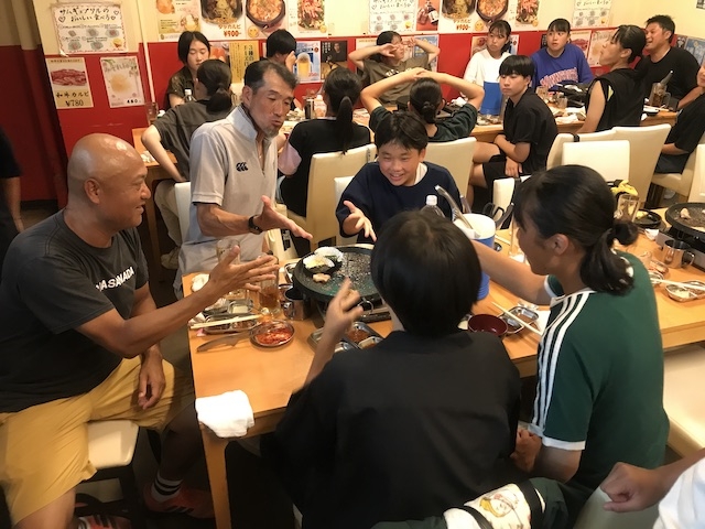 込山コーチが焼く担当、周りにいるのは食べる担当?