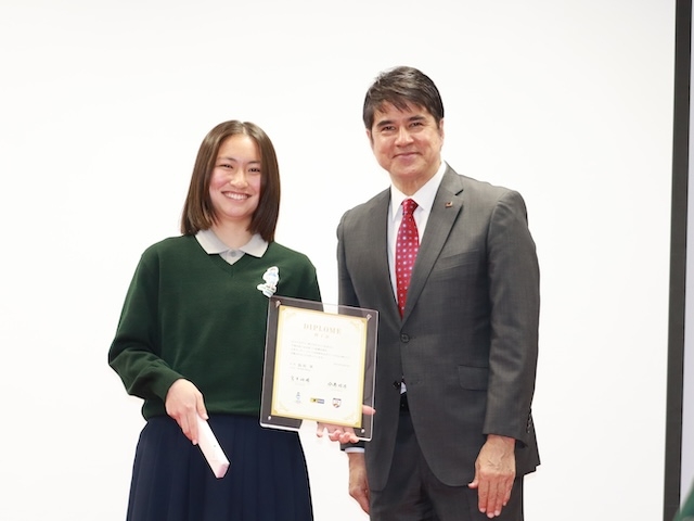 永島スクールマスターから卒校証書と堺市からの記念品を受け取った中島。