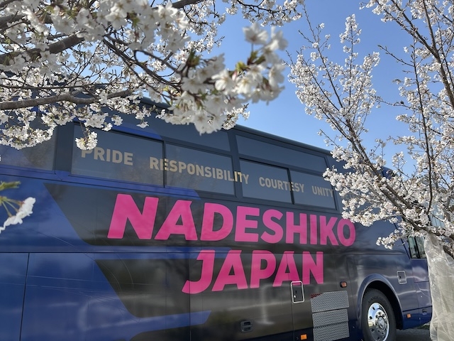 なでしこの選手が会場に到着です。バスを見て、すでに緊張しているアカデミー生もいました。