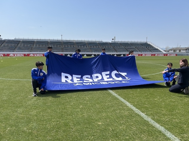 この日のアカデミー生は始業式を終えてお昼に下校だったため、試合の運営のお手伝いをさせてもらいました。憧れの選手たちを間近に見られる絶好の機会です。任された主な業務はボールパーソンと選手入場時に国旗とリスペクトフラッグを持って選手と一緒に入場する担当です。