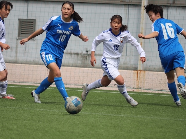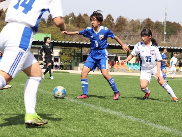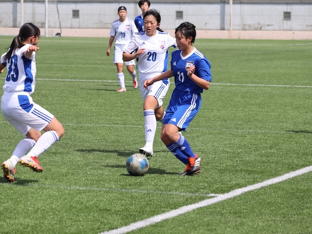 堺の初戦の相手は静岡県選抜U-14女子です。アカデミー堺にも東海地域出身の選手が多く在籍しているので、東海トレセンなどで顔を合わす選手も多くプレーしていたようです。試合はアカデミー堺が先制したもののその後は苦しい展開。ミスから失点を重ね前半は1-2で折り返します。後半に入ってからは何度もゴール前まで攻め込むも決めきることができません。ゴールに向かう姿勢は見せたものの後半も1-2。トータルスコア2-4で黒星スタートとなりました。その後すぐにアカデミー堺の1年生が静岡県トレセンとトレーニングマッチ(30分×2本)を行いました。