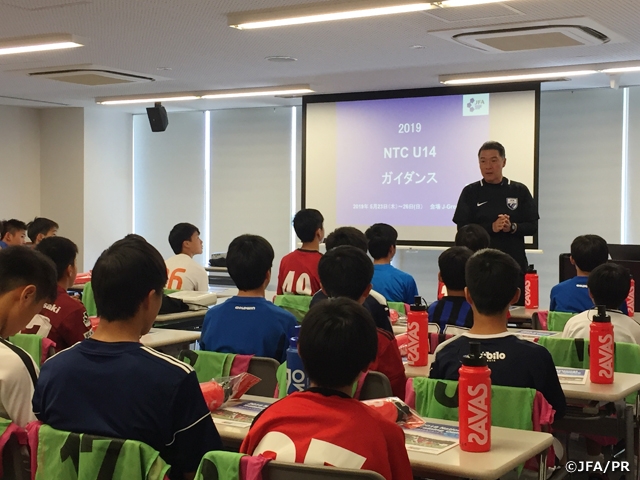 まずはU-13、U-14のそれぞれの選手が同じ会場に集まり、ナショナルトレセンコーチから本キャンプの目的が伝えられました。