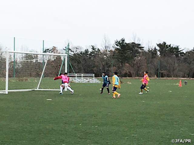 1日目は、「ゴールへ向かう(組み立て)」「ボールを奪う(連携連動)」、2日目は「ゴール前の攻防~クロスの攻撃~」のテーマで行いました。積雪の関係で日常のトレーニングを屋内で行っている選手もいたことから、最初は不慣れな天然芝のピッチに戸惑う場面も見られましたが、徐々に本来のプレーを表現するようになってきました。