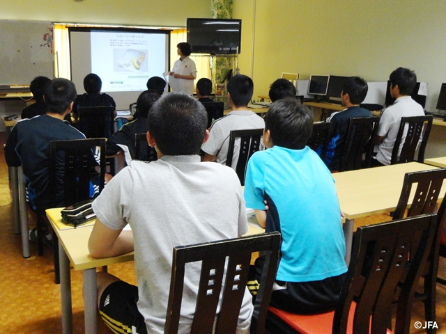 今回初めてセミナーを受講した9期生(中学1年生)は、食事の大切さや選手にとって必要な栄養素について、2回目の実施となった7・8期生(中学2・3年生)は、補食の意味やとり方を学びました。
