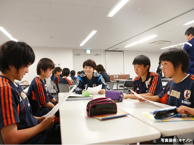 夜はロジカル・コミュニケーションスキルの授業がありました。コミュニケーションスキルはJFAエリートプログラムが2003年に始まったときから導入されていて、積極的に言葉を交わそう、自分の意志を伝えられるようになろうという狙いとともに、言葉・言語を通じて「考えるトレーニング」をする、考えてサッカーをする、ことにつなげていこうという目的があります。選手たちは「コミュニケーション・スキルって何? 何するの?」と最初は不安そうでしたが、自己紹介や問答ゲームで自分の考えや気持ちを自分の言葉で発していくうちに、不安や恥ずかしさが楽しさやおもしろさに変わっていったようでした。また、ピッチ上ではない場面で、自分自身やお互いに発見、気づきがあり、より仲間を理解することにもつながったようです。