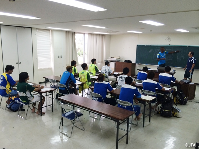 東京、熊本での開催に続いて3回目となる今回は、沖縄県内から13名の選手・指導者が参加し、メンデス監督の講義に熱心に耳を傾けていました。