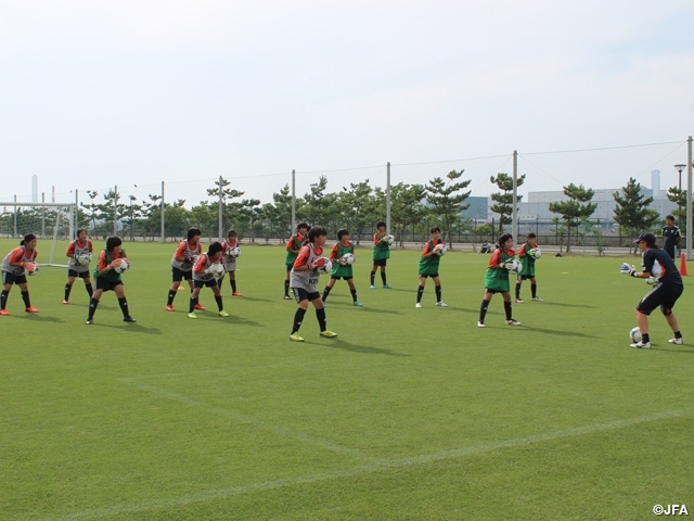 小学生のグループは、スーパー少女プロジェクトのチーフの西入コーチ、2012年までなでしこリーグで活躍していた大友コーチから優しく楽しく指導を受けます。中学生はなでしこジャパンGKコーチの前田コーチ、U-17日本女子代表GKコーチの川島コーチと、ときには厳しい声がかかるときもありますが、基本から丁寧に指導を行います。選手たちは真剣な顔と笑顔、そして元気な声が出ていて、習ったことにどんどんチャレンジしていました。