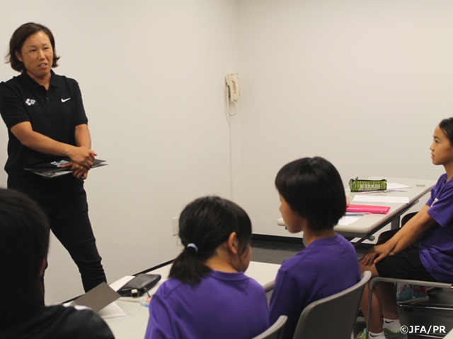 また、夜のミーティングでは、今回コーチとして参加していただいている元なでしこジャパンの山郷のぞみさんから、自身の経験談を交えて選手たちへレクチャーをしていただきました。