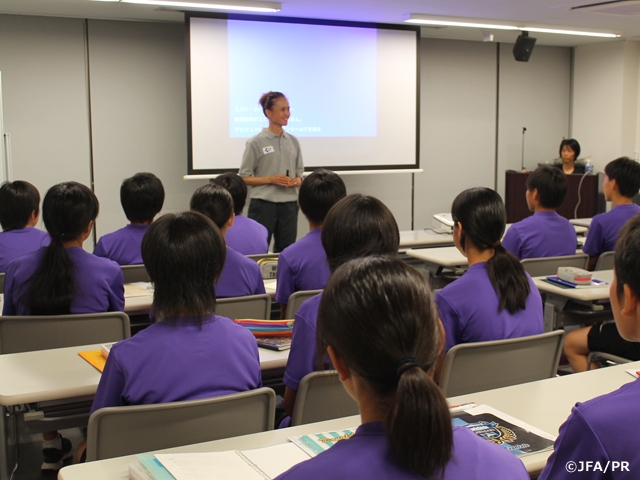 本格的なトレーニングがスタートした2日目。3つのグループに分かれ、「守備」、「ポゼッション」をテーマに午前、午後と2回のトレーニングを行ったほか、夜にはなでしこジャパンの高倉麻子監督からレクチャーを受けました。自身が指揮を執ったU-17日本女子代表が前回のFIFA U-17女子ワールドカップコスタリカで優勝を果たした話を交えながら、これから世界の舞台を目指す選手たちにとって何が大切かを伝えました。