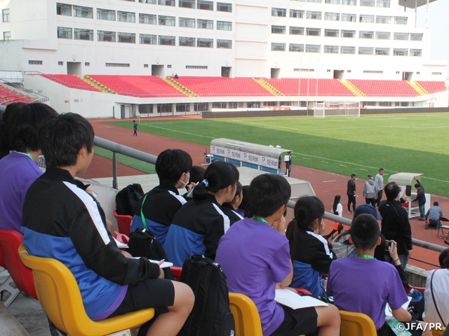 中国遠征3日目となる4月16日(日)、U-14日本女子選抜はホスト国の中国を相手に、EAFF U-15 Girls Tournament 2017大会初戦を迎えました。選手たちにとって初の公式な国際試合となるこの中国戦。Jinshan Sports Centerの大きなメインスタジアムで、FIFAアンセムでの入場を行い、緊張の面持ちでピッチに立ちました。試合は前半8分に先制を許したものの、27分に相手のオウンゴールを誘い同点に追いつくと、後半21分には天野選手のゴールで逆転。初戦を勝利で飾りました。また、試合後は同グループの韓国と朝鮮民主主義人民共和国の試合を全員で視察しました。それぞれの視点で試合の分析を行い、次の対戦へ向けて、夜のミーテイングでは分析結果の発表も行いました。日本の二戦目は18日(火)、韓国との対戦になります。