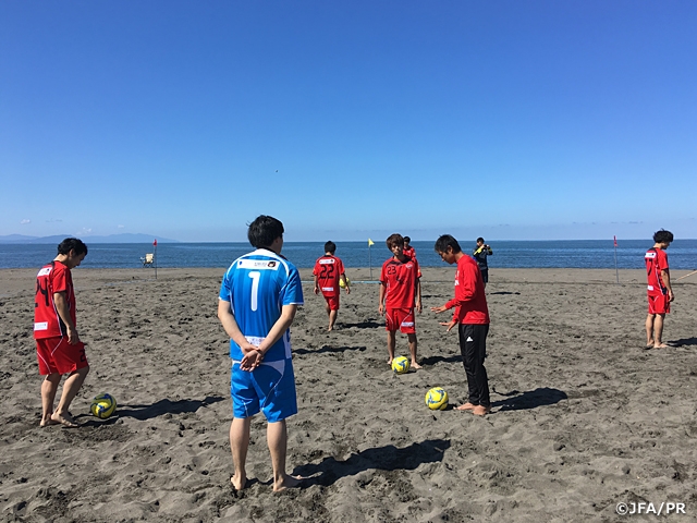 午前は各チームごとにスコップなどの基本的な技術のレクチャーを実施し、午後は戦術を中心に実施しました。最後に、ビーチサッカー特有のフリーキックの練習やパスからのシュート練習など行い、大会に向けてそれぞれ良いプレーが発揮できるように練習しました。