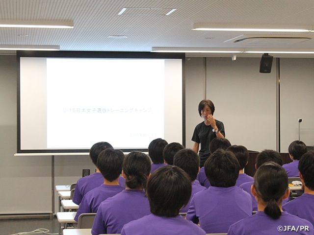 9月30日(土)にスタートしたU-15日本女子選抜の活動は二日目を迎え、本格的なトレーニングがスタートしました。午前のトレーニング前のミーティングでは、視察に訪れたなでしこジャパンの高倉麻子監督から激励があり、選手たちはそれぞれの想いを胸に、グラウンドに立ちました。午前、午後とトレーニングを行い、夜のミーティングでは今回のキャンプの統括責任者でもある大部由美コーチから「なでしこらしさ」や、なでしこジャパンを目指すため「今何をすべきか」といったテーマでレクチャーがありました。また、その後は加藤賢二監督から映像を交えて「世界基準に近づくために」必要なこと、「世界のサッカーと日本のサッカーの差」をトピックにしたレクチャーを受け、キャンプ二日目を終えました。