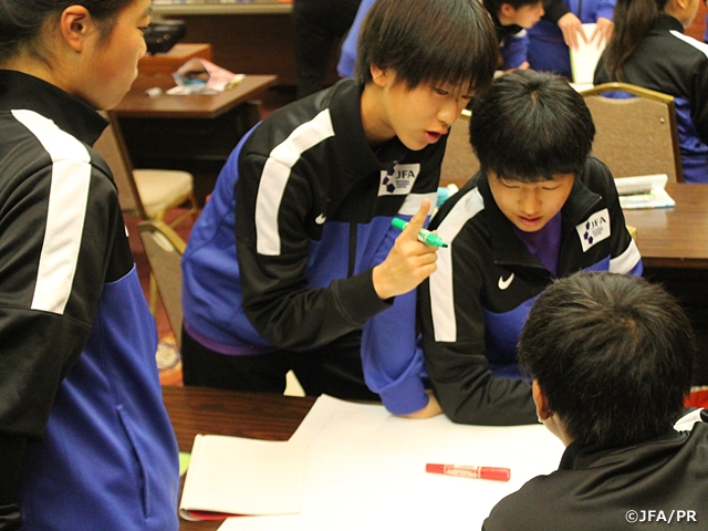 女子GKキャンプ2日目の18日(土)は、朝からあいにくの空模様となりましたが、午前、午後とトレーニングを行いました。雨足が心配される中、24名の選手たちは「攻撃参加」、「シュートストップ」をテーマにトレーニングを実施。また、夜のミーティングでは、9月に行われたAFC女子U-16選手権の映像を見ながら、それぞれの視点で試合の分析をし、グループごとに分析結果の発表を行いました。
