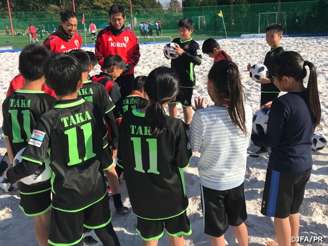 初日の9日(土)の午前は、地元の小学生が参加しクリニックを実施しました。砂の上での走り方からスコップの体験など、ビーチサッカー特有のプレーを体験しました。最後にはインストラクター対子どもたちでゲームを行い、大いに盛り上がりました。