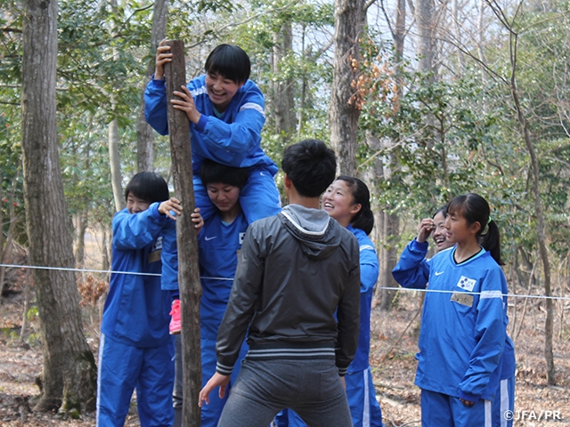 今回、最初のプログラムとしてびわこ成蹊スポーツ大学の協力のもと、ASE(Action Socialization Experience)活動を行いました。「野性の森」と称した森のなかには仲間と協力しなければクリアできない課題がいくつも設置されていました。選手たちは様々な課題を前に、どうしたら解決できるのかそれぞれのグループで話し合いながら取り組みました。「できないかも」と思うような課題に対しても時間をかけて臨み、課題を克服する姿が印象的でした。活動の振り返りでは、「課題解決に必要なコミュニケーションや協力といった要素は自然の中でもサッカーのピッチ上でも変わることはない」と教えていただき、あらためてチームとして戦うために必要な要素を気づかせていただきました。また同大学に勤務されており、今回のプログラムをコーディネートいただいた望月聡氏(元なでしこジャパンコーチ)には、グラウンドに出て「サッカーの目的」といったテーマでトレーニングを行っていただきました。あらためて望月氏をはじめ、びわこ成蹊スポーツ大学関係の方々に感謝申し上げます。