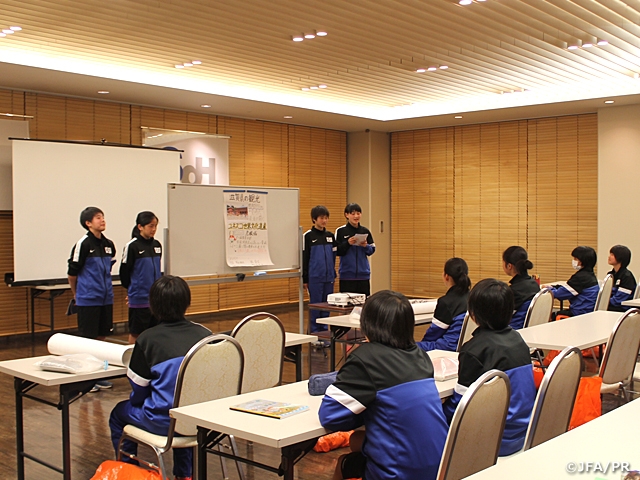 滋賀県内で3月26日(月)に始まったJFAエリートプログラム女子U-13のトレーニングキャンプも28日(水)、3日目を迎えました。前日のキャンプ2日目には山梨県のUスポーツクラブ(男子U-15)との練習試合を行いました。体格やスピードで差のある男子チームとの対戦で、前半は連続で失点を許すなど苦戦を強いられる展開となりましたが、選手たちは「世界基準で戦うこと」を改めて意識し、結果は0-8で敗れたものの、後半は気持ちの面でも一歩成長がみられた試合となりました。また、オフザピッチでは、東京大学医学部付属病院女性診療科・産科の能瀬さやか先生による月経についてのレクチャー、大野真ナショナルトレセンコーチから「世界のなでしこになる」というテーマでの講義を行いました。3日目は、至学館高校(女子)との練習試合を行い、ひとつ上のカテゴリーの相手に対し積極的に試合を運び14-0で勝利し、この活動の成果、これからの課題が感じられました。夜には、「琵琶湖」「滋賀県の歴史」などのテーマをグループ別にまとめてそれぞれ発表を行いました。最終日の4日目にはキャンプの集大成として、紅白戦を行います。