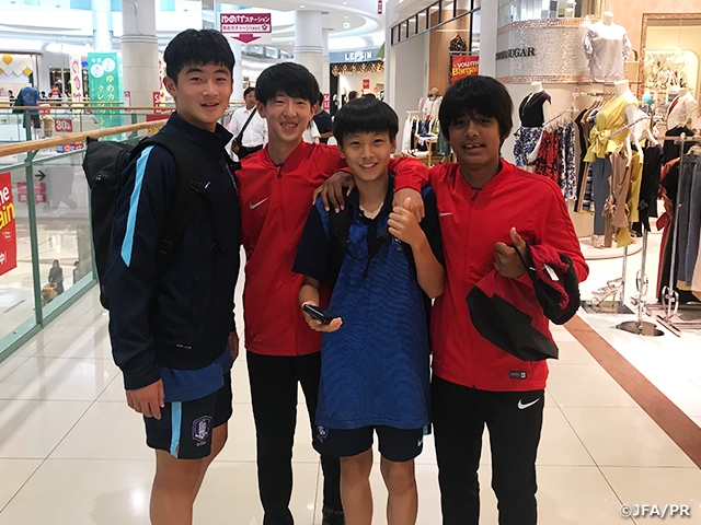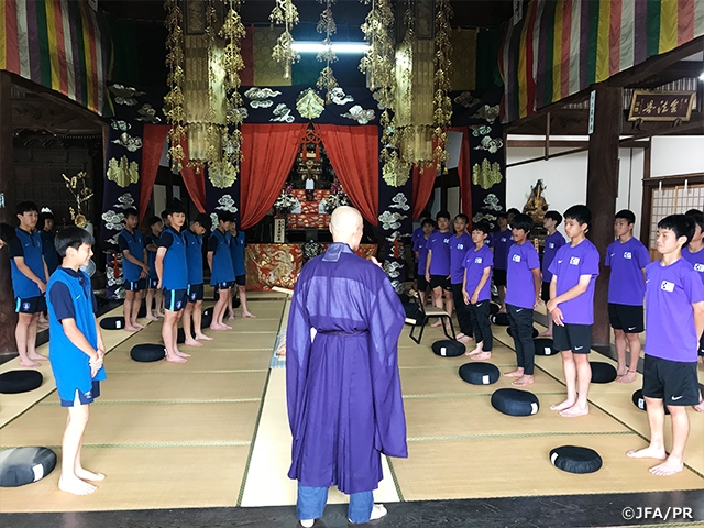 エリートプログラムU-13 3日目の28日(木)は、U-13韓国代表と練習試合を行いました。前半は自分たちのペースで進めていた日本チームですが、一瞬の隙を突かれて韓国チームに先制されました。後半は前半以上にボールを保持しながら、ゴールへ向かうプレーが増え、2点を奪った日本チームが逆転。韓国チームも点を取り返すためにプレッシャーをかけ、日本チームは守備に追われる時間が続きました。韓国チームの猛攻を凌ぎながら、相手のミスを逃さず、日本チームは3点目を決め、3対1で勝利しました。翌日の29日(日)は、オフザピッチプログラムとして両チームで坐禅体験やバーベキューを行い、親睦を深めました。また、日本、韓国選手でグループを組み、日本の選手達の案内でショッピングセンターに行きました。両チーム選手たちの笑顔が多く見られ、ピッチ内外で有意義な時間を過ごしました。30日(土)には、韓国チームとの練習試合の2戦目を行います。