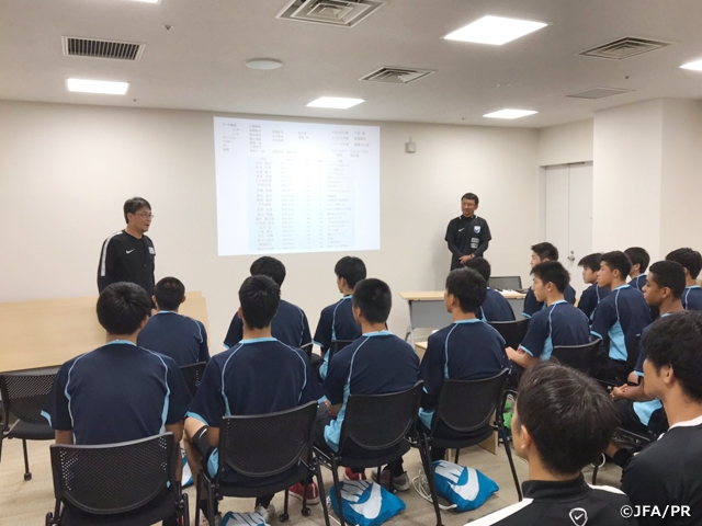今回のトレーニングキャンプには、U-18(U-17、U-16を含む)10名、U-15(U-14を含む)10名、合計20名の選手を招集しました。初日のオープニングガイダンスでは、関塚隆技術委員長から、このキャンプでは思いきりチャレンジしてGKとして成長する機会にしてほしいと激励の挨拶がありました。また2月のキャンプに続きアドバイザーとして参加していただいているフック氏からも、「ミスを恐れずどんどんチャレンジしてほしい。ミスをすることが問題ではない、問題はチャレンジしないことだ」というメッセージをいただきました。こうした言葉に背中を押され、各グループを担当するGKコーチの熱意のこもった指導のもと、今日のテーマ「シュートストップ」では、基本となるテクニックから、FW、DF役の選手がいるなか、試合状況の切り取られたシーンの中でゴールを守ることに積極的にチャレンジする姿が多く見られました。GKの一番重要な仕事はゴールを守ること。それをベースに、明日以降の「ブレイクアウェイ」「クロスの守備」「攻撃参加」といった各テーマでもさらなる積極的なチャレンジを期待したいと思います。