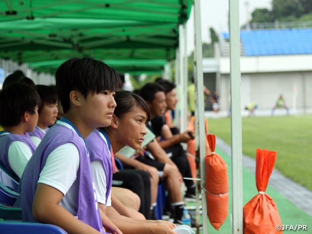 韓国で開催されているEAFF U-15 Girl's Football Festival 2019に出場しているU-15日本女子選抜。韓国入りから4日目となる8月6日(火)、大会第2戦目はチャイニーズ・タイペイとの対戦となりました。大会の雰囲気に慣れてきた選手たちは前半、立ち上がりから素早いプレッシングとボールポゼッションで主導権を握り、前半12分、榊原琴乃選手のゴールで先制点を奪います。試合前のミーティング時に、コーナーキックの際、ニアに飛び込むことを確認しましたが、実際にニアに飛び込んで敵を引き連れてできたファーのスペースに榊原選手が飛び込み、確実にゴールに繋げることができました。その後、ゴール前の崩しだけではなく、ミドルシュートなどから得点を重ね、前半を4-0で折り返します。後半、ハーフタイムで選手5人を交代した日本は、前半に引き続き素早いプレッシングで相手の攻撃の芽を摘みます。攻撃時には、ミドルシュートからの得点やDFラインから相手の背後へのロングフィードからの得点のような、優先順位を意識した攻撃が多く見られ、後半も試合を優位に進めた日本は5ゴールを奪い、9-0で勝利を収めることができました。明日、大会第3戦目は韓国との対戦となります。