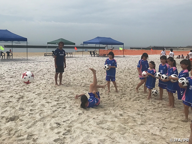 2日目はビーチサッカー大会決勝前にクリニックを実施。各チームにインストラクターが助っ人として入って試合を行い、華麗なプレーで観客を魅了するとともに、積極的にチャレンジする子供たちの良いプレーを引き出すなど、会場は大いに盛り上がりました。
