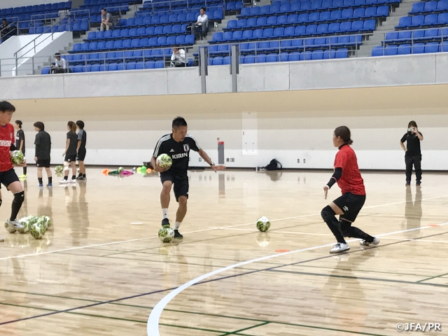 この日は、JFA公認指導者を対象としたリフレッシュ研修会を実施した後、府中アスレティッククラブプリメイラの選手と、数名の関東近県に在住の女子Fリーグ所属選手が参加し、フットサル日本女子代表の木暮賢一郎監督と内山慶太郎ゴールキーパーコーチによるトレーニングを行いました。
