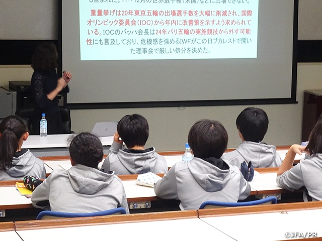 JFAアカデミー福島女子では11月9日に、国立スポーツ科学センター土肥美智子先生にアンチ・ドーピングについて講義していただきました。中学生には基本的な部分を、高校生には実例とその背景についてより深くお話していただきました。アカデミー生達はこの講習会を通して、自分が口にするもの全てに責任があるということを再認識しました。