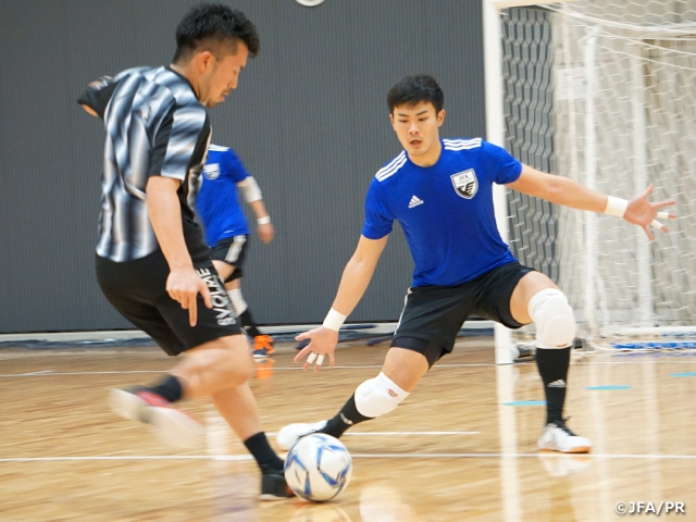最終日の3セッション目では初日に取り組んだ内容を複合的に実践する、試合に近い内容のメニューに取り組みました。短い期間の中でも選手たちは同世代の同じポジションの選手たちと切磋琢磨する関係を築き、トレーニング中には互いに声を掛け合う姿が見られました。また活動期間中にはU-19フットサル日本代表の木暮賢一郎監督も会場を訪れ、育成年代の選手たちのトレーニング姿を見学しました。