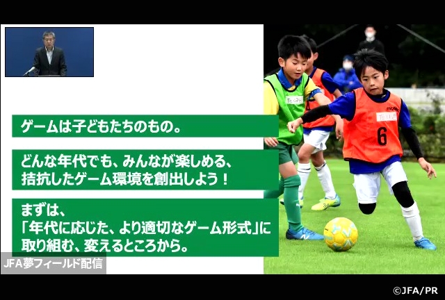 中山部会長は「普及の観点から、選手がサッカーを楽しむ環境をつくっていく、そして指導者がどのように関わっていくかが大事になる」と話し、選手の特性やニーズに応じた指導の考え方を伝達しました。また、U-10年代向けに作成した「ミニサッカーガイドライン」を紹介。各FAでガイドラインを活用した少人数制サッカーの推進を求めました。