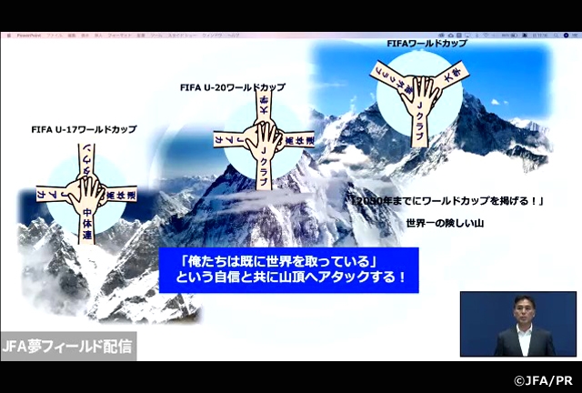 JFA技術委員会が注力する一つとして、反町委員長は「FIFAワールドカップトロフィーを掲げるために、近い将来、育成年代の2つのワールドカップで優勝したいと思っている」と話した上で、「サッカーにおける世界大会はその国の総合力が如実に表れる。日本はもう一歩のところまで来ている。皆さんの力なくして、ワールドカップ優勝はない。代表は遠くにあるものではなく、近くにあるものと考えてもらいたい」と語りました。
