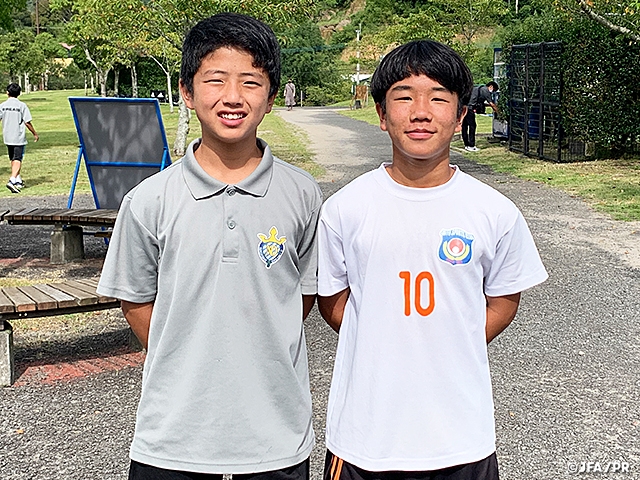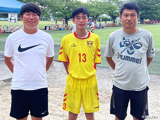 JFAアカデミー熊本宇城所属の大山鉄心選手(12期生/中2)は得点に絡むことができたり、得点を奪うこともできる選手なので、主に攻撃的なポジションでプレーさせています。だからこそ、1試合を通じて攻守に関わり続けるフィジカル(体力)の課題を克服してほしいです。今は身長も高く、体格を生かしてプレーできていますが、もっと先を見据えて更にテクニックを磨いておいて欲しいと思います。
